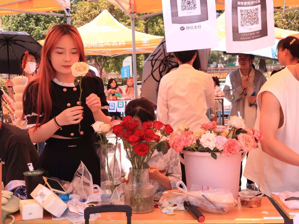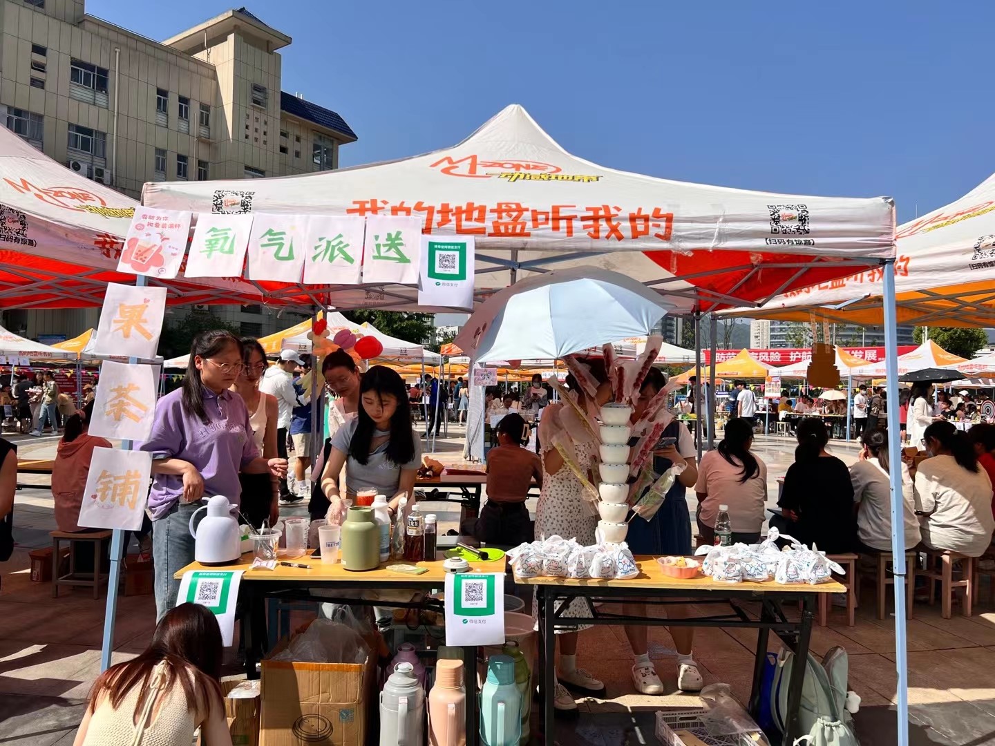 特色烤肠,串串香,台湾车轮饼等层出不穷的美食吸引同学驻足,也有化妆品,面膜,小饰品这些深受女生喜爱,更有证件拍摄以及自制果茶等别具一格的创新项目。