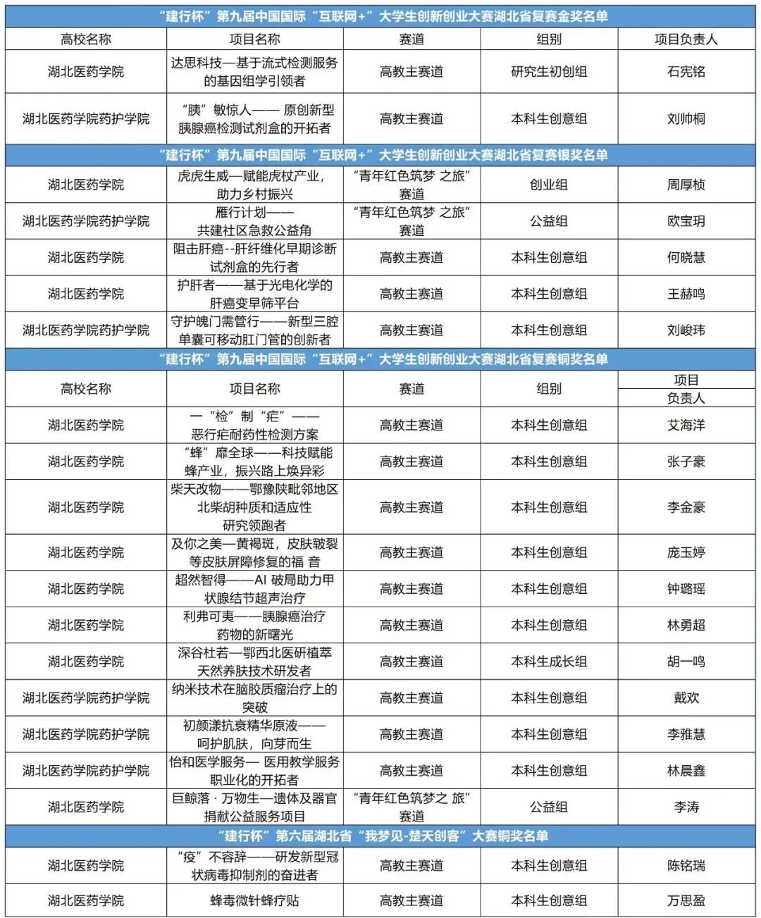 近日,第九届中国国际“互联网+”大学生创新创业大赛湖北省复赛在湖北工业大学圆满落幕。本届赛事,湖北医药学院师生参赛热情高涨,共申报项目1200个,参赛6600余人次,经过激烈角逐,湖北医药学院获金奖2项,银奖5项,铜奖13项的好成绩,获奖数量再创历史新高。