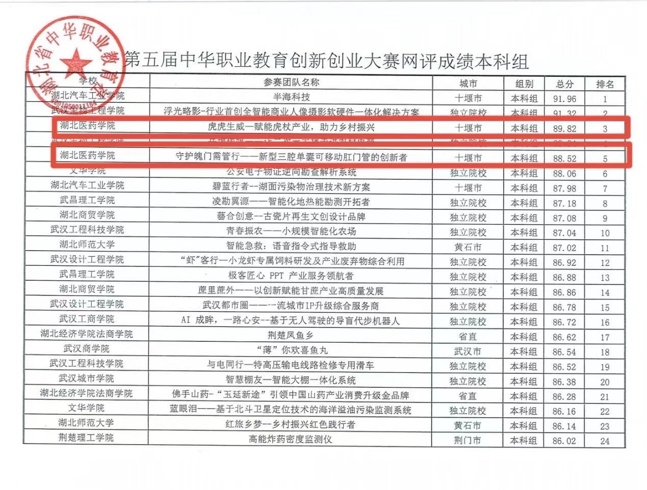 本网讯(通讯员 周厚桢)2023年9月15日,湖北省中华职业教育创新创业大赛复赛网评成绩出炉,我校共有两支团队进入决赛!其中,由张勇洪,罗汀,李海涛三位老师指导的《虎虎生威——赋能虎杖产业,助力乡村振兴》项目和由狄茂军,李海涛,罗汀三位老师指导的《守护魄门需管行——新型三腔单囊可移动肝门管的创新者》分别获得本科组全省第3、第5名的好成绩。