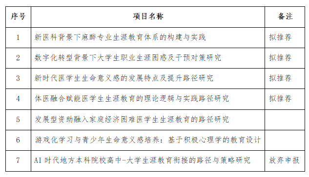 学校于7月份启动了2025年湖北本科高校省级教学改革研究项目(生涯教育与就业指导专项)申报工作,经教师个人申请、学院遴选推荐,经组织专家评审,最终确定4个项目分别从校本部和药护学院推荐申报省级项目。现将评审结果公示,公示时间: 自9月17日起至9月22日结束。公示期间,若有异议,请联系创新创业学院。联系人:董艳宁;联系电话:13872820445。