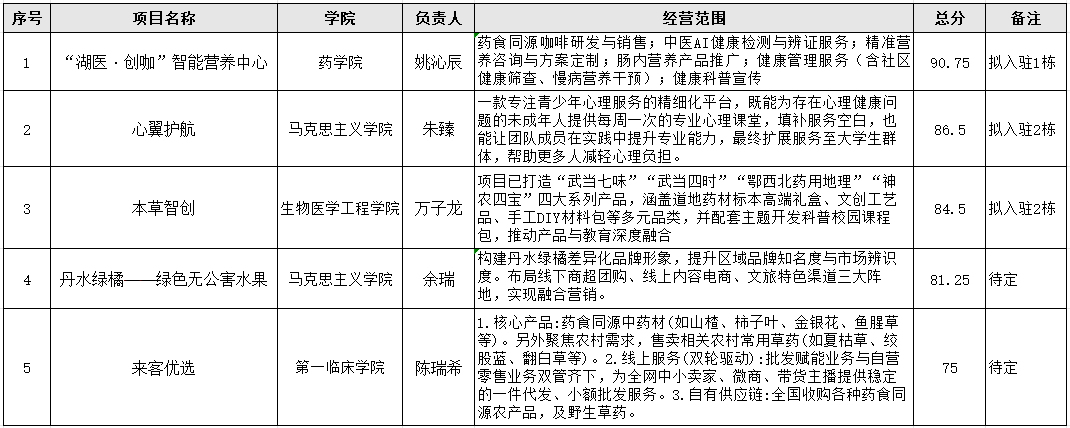 根据《关于甄选创新创业项目入驻生物医药科技园的通知》要求,经由创业项目专家评审会议研究,拟同意““湖医·创咖”智能营养中心”、“心翼护航”“本草智创”3个项目入驻生物医药科技园。现将拟入驻项目名称予以公示,广大师生对评审结果若有异议,请于2026年1月19日前向大学生创新创业学院反映。大学生创新创业学院电话:0719-8891169;纪委电话:0719-8891077。